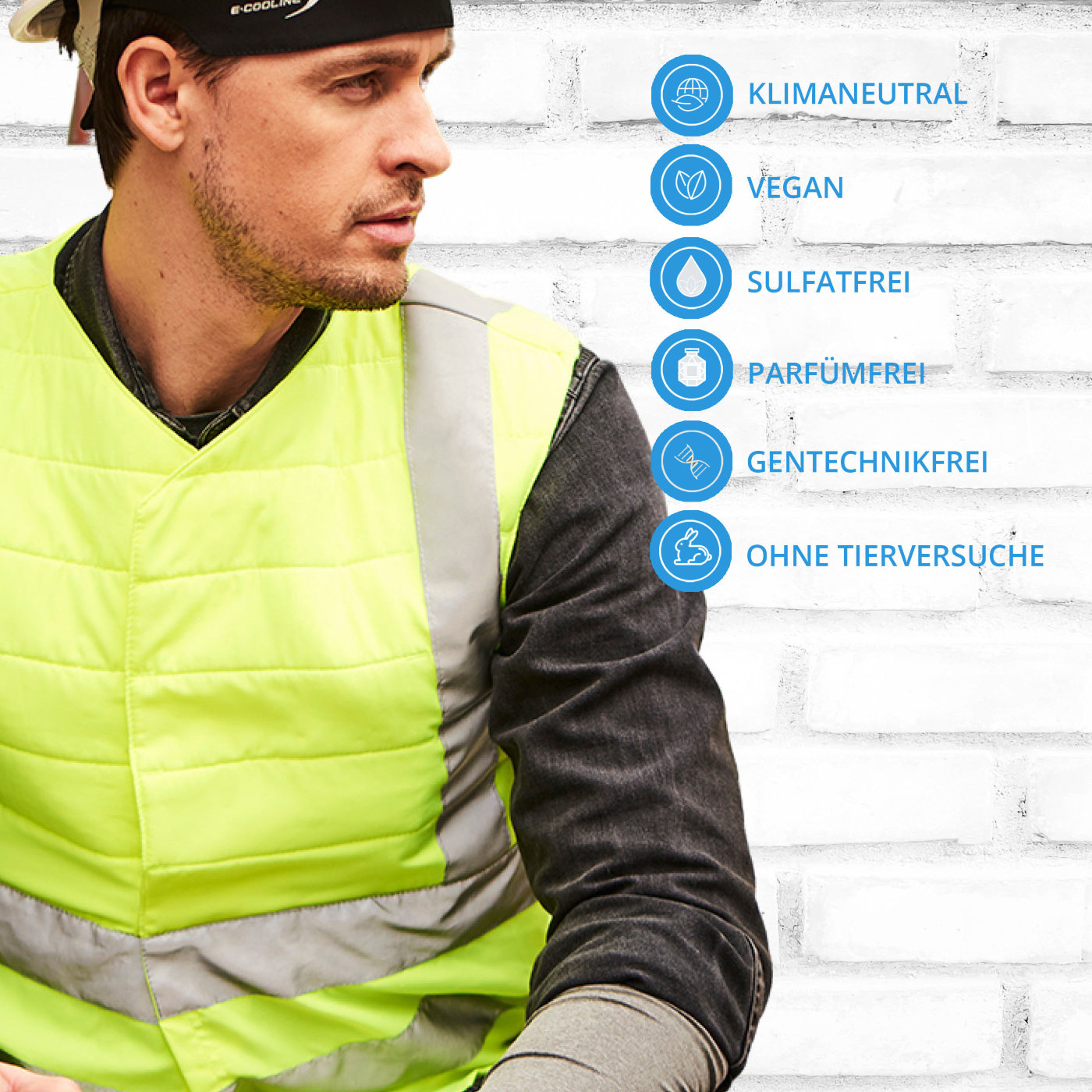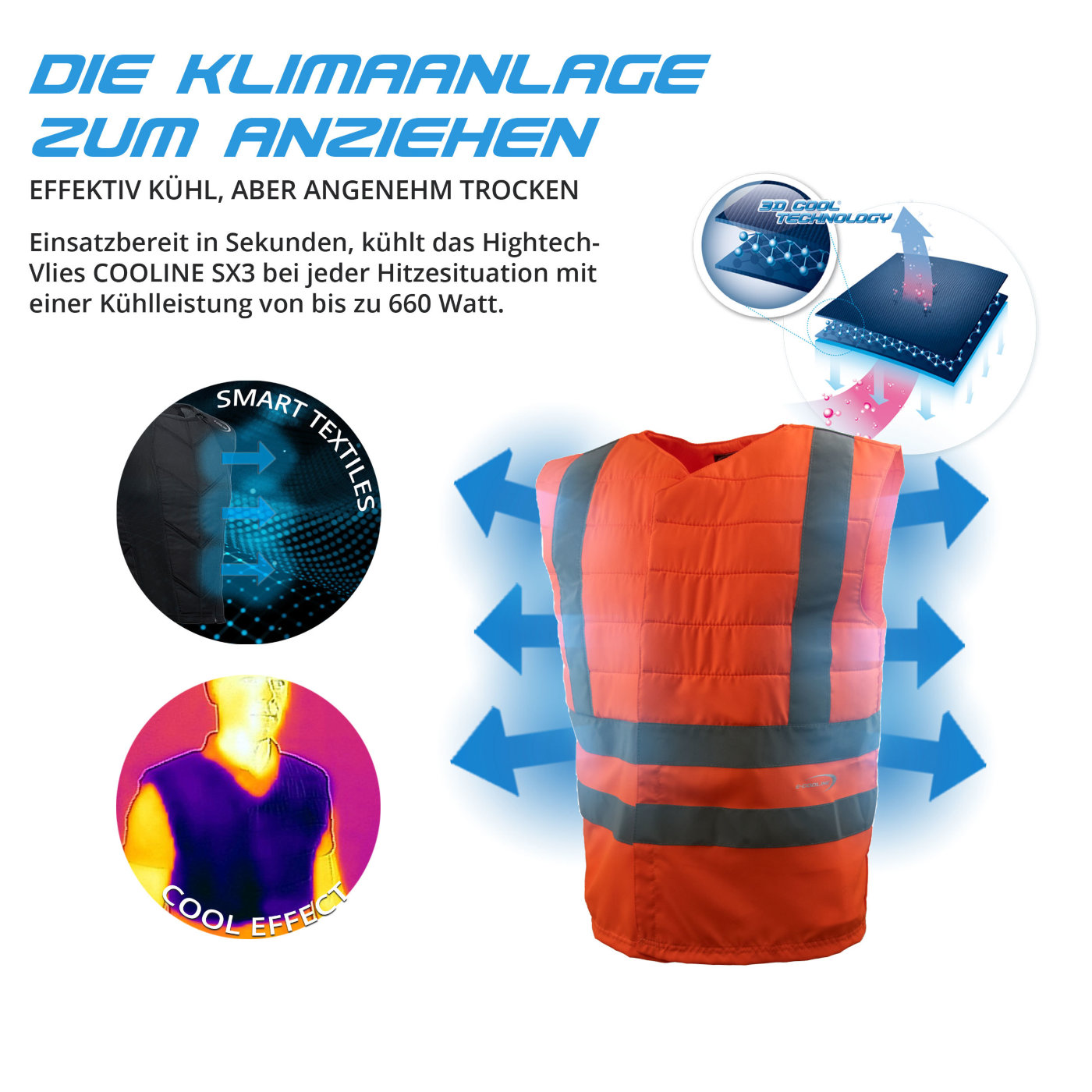 Cooline® SX3 3D-Mesh tehnologija • 660 Watt hlajenje z izhlapevanjem • učinek hlajenja testiran in potrjen s strani inštituta HOHENSTEIN, po DIN SPEC 60015 • enostavna in hitra aktivacija, nanesi vodo – zvij in osuši • prijeten kroj • odličen komfort nošenja • pralno pri 30°C, antibakterijsko, higienično