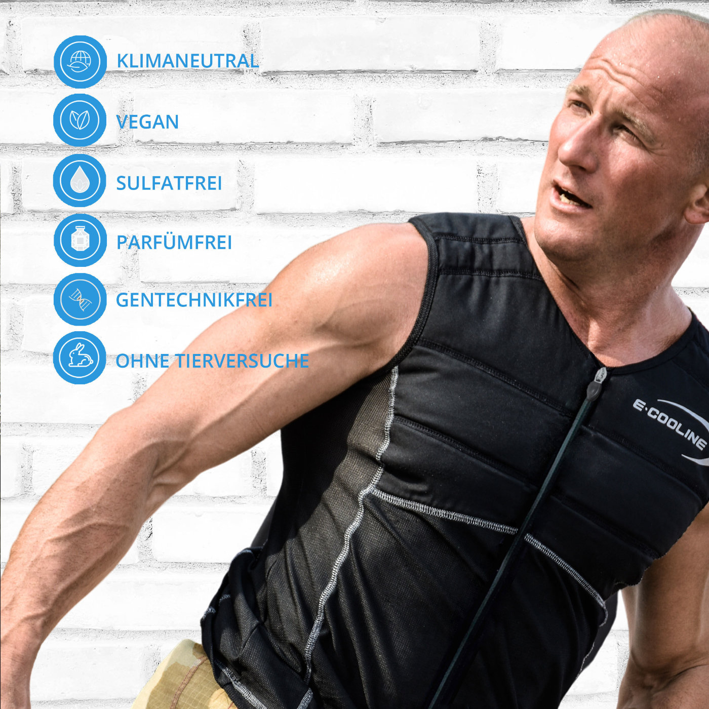 E.COOLINE® Powercool SX3 hladilni jopič • ergonomsko prileganje • 25 hladilnih blazinic s tehnologijo Cooline® SX3 3D-Mesh • 660 W izhlapevalnega hlajenja • hladilni učinek testiran in potrjen s strani inštituta HOHENSTEIN, v skladu z DIN SPEC 60015 • enostavna in hitra aktivacija, dodaj vodo – zvij – posuši • pralen pri 30 °C, antibakterijski, higienski