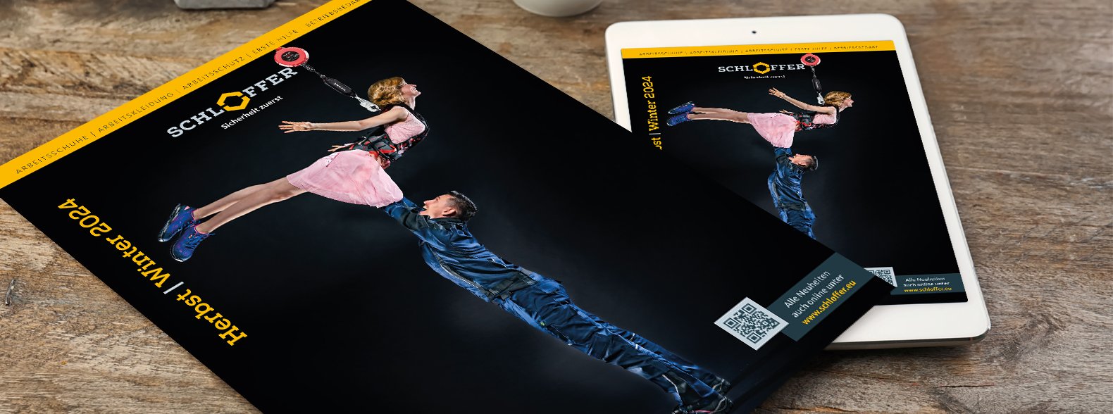 Varnost pri delu z razliko: brez gradbišča, brez visokih odrov, brez globokega jaška. Postavitev, ki je v zvezi z varnostjo pri delu ne bi pričakovali. Pri Schlofferju redno proučujemo temo varnosti pri delu iz presenetljivih, nepričakovanih perspektiv – da bi z ustvarjalnimi idejami in kampanjami vzbudili še več pozornosti in ozaveščenosti o varnem delovnem okolju. To se je zgodilo tudi za naslovnico nove brošure jesen/zima.