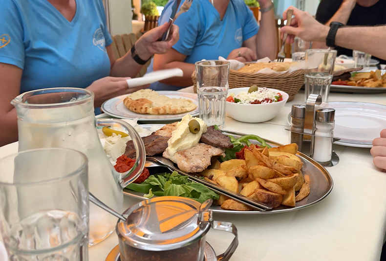 Po hitrem spustu smo dan zaključili v bližnjem restavraciji, ki je znana po odlični balkanski kuhinji. Tam so nas čakali „šopska solata“, mešana solata iz sveže zelenjave in ovčjega sira, hrustljavi pečeni krompir, sveže pečeno lepinjo iz krušne peči in seveda najboljše pleskavice na svetu. Ob hladnih pijačah in v sproščenem vzdušju smo se smejali, jedli in živahno klepetali. Še posebej lepo je bilo opazovati, kako so ekipa Avstrije, Slovenije in Hrvaške, skupaj oblikovali veliko skupnost. Po neuradnih podatkih naj bi se nekateri celo poslovili šele po polnoči. To verjetno pove vse o odličnem vzdušju!
