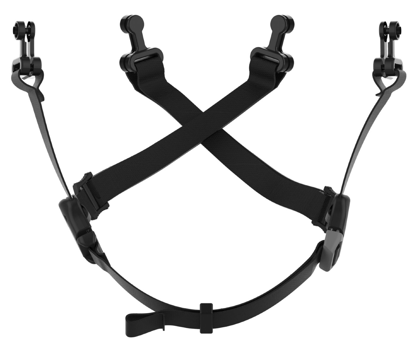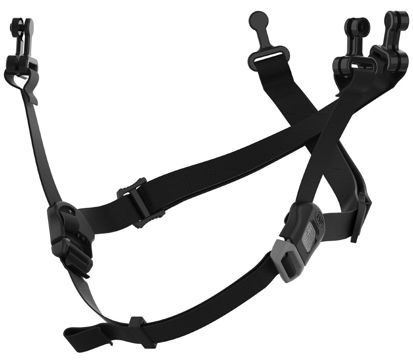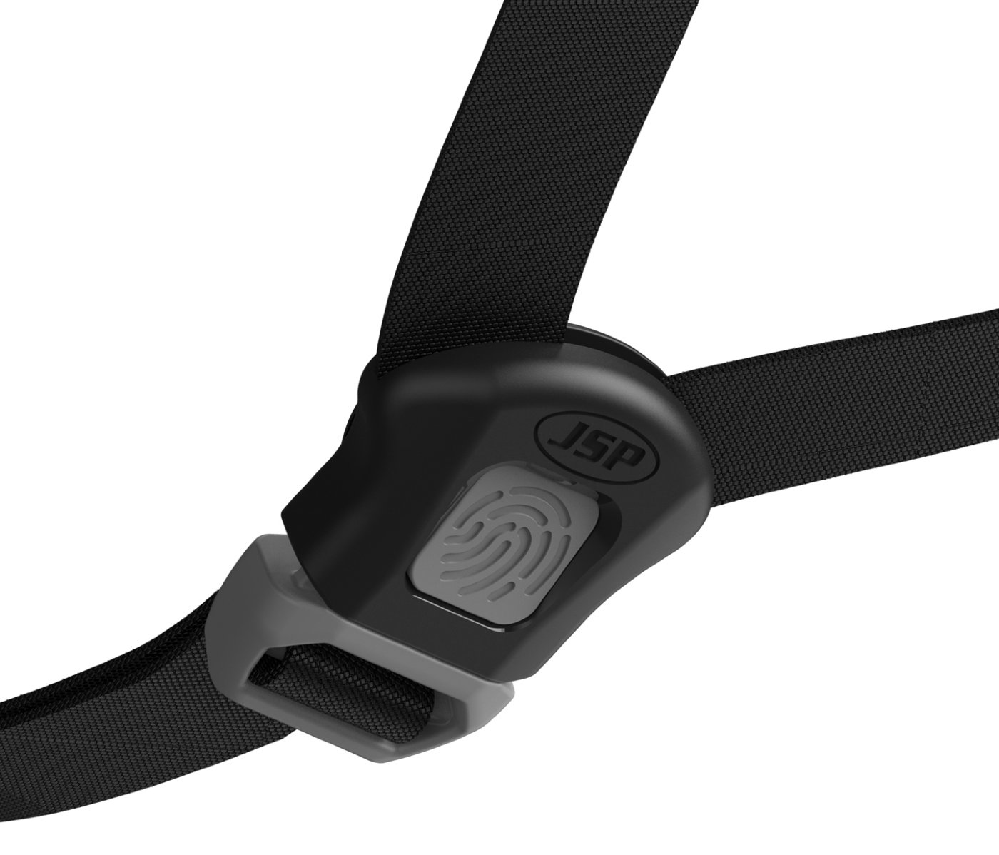 4-točkovni bradni pas, primeren za zaščitne čelade JSP® EVO® • samodejno se odpre pri sili med 150 in 250 Newtoni • zaradi nastavljivosti zagotavlja varno prileganje • rpiemren tudi za čelade JSP® EVOLite z vrtljivim gumbom in zračenjem