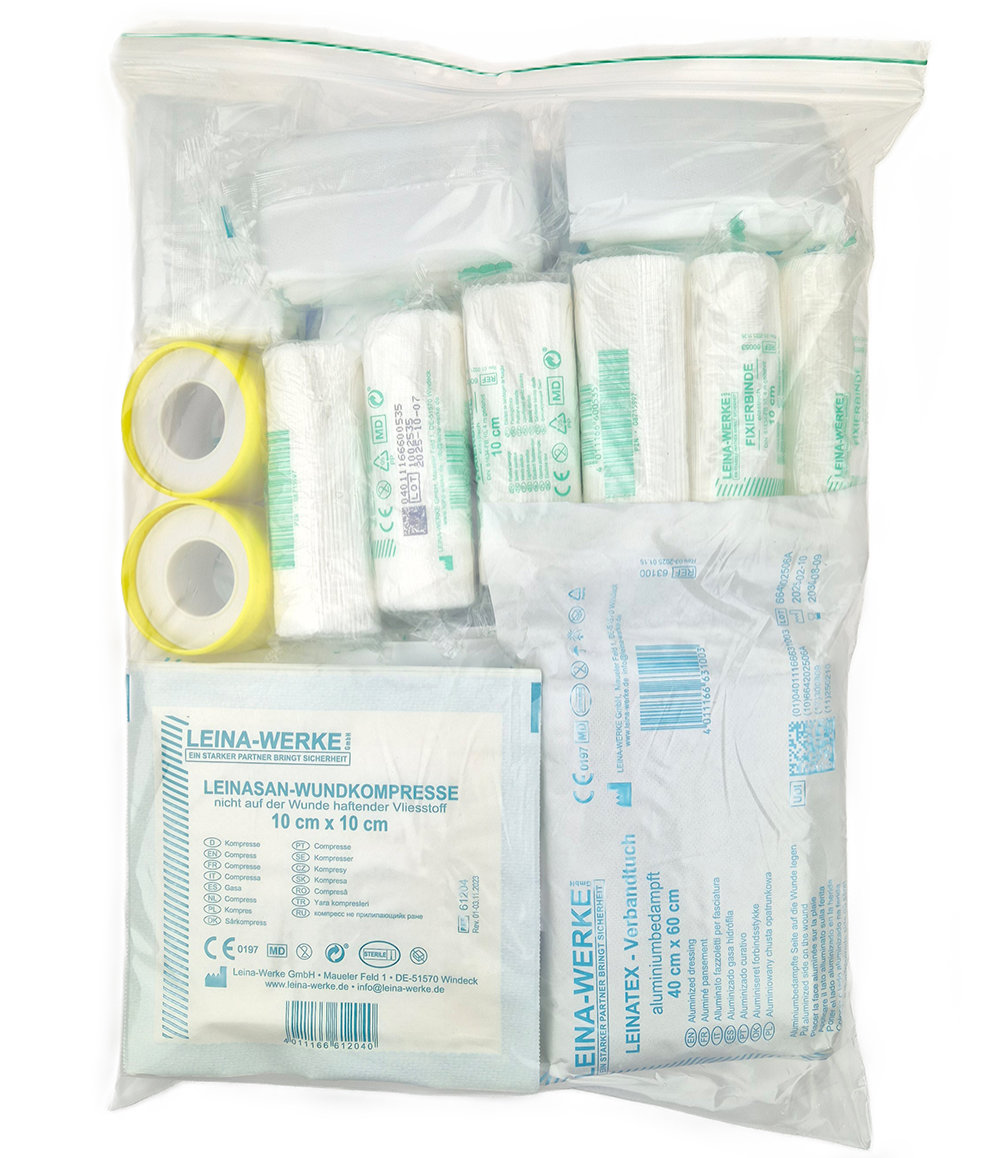 Polnilo za prvo pomoč po predpisu ÖNORM Z 1020:2025 v plastični vrečki za komplet prve pomoči.