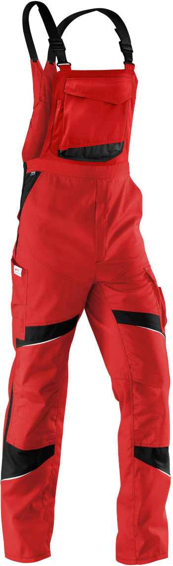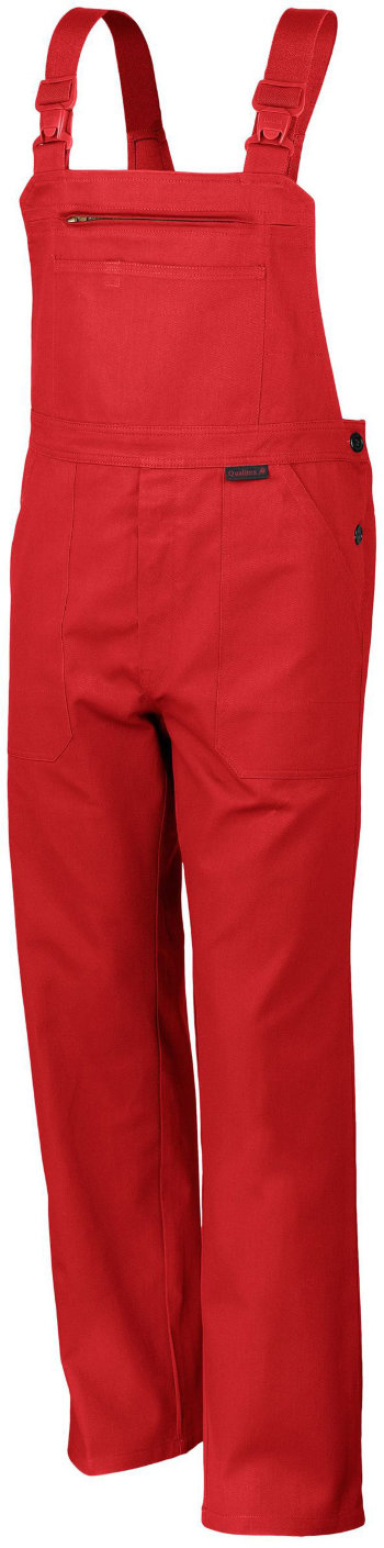 Protivrezni zaščitni vložek spredaj (model A) • odbija vodo in umazanijo • nastavljive, elastične naramnice • nastavljiv obseg pasu • 1 prsni žep z zadrgo • 2 stranska žepa • 1 zadnji žep • žep za meter • kontrastni material v rdeči barvi